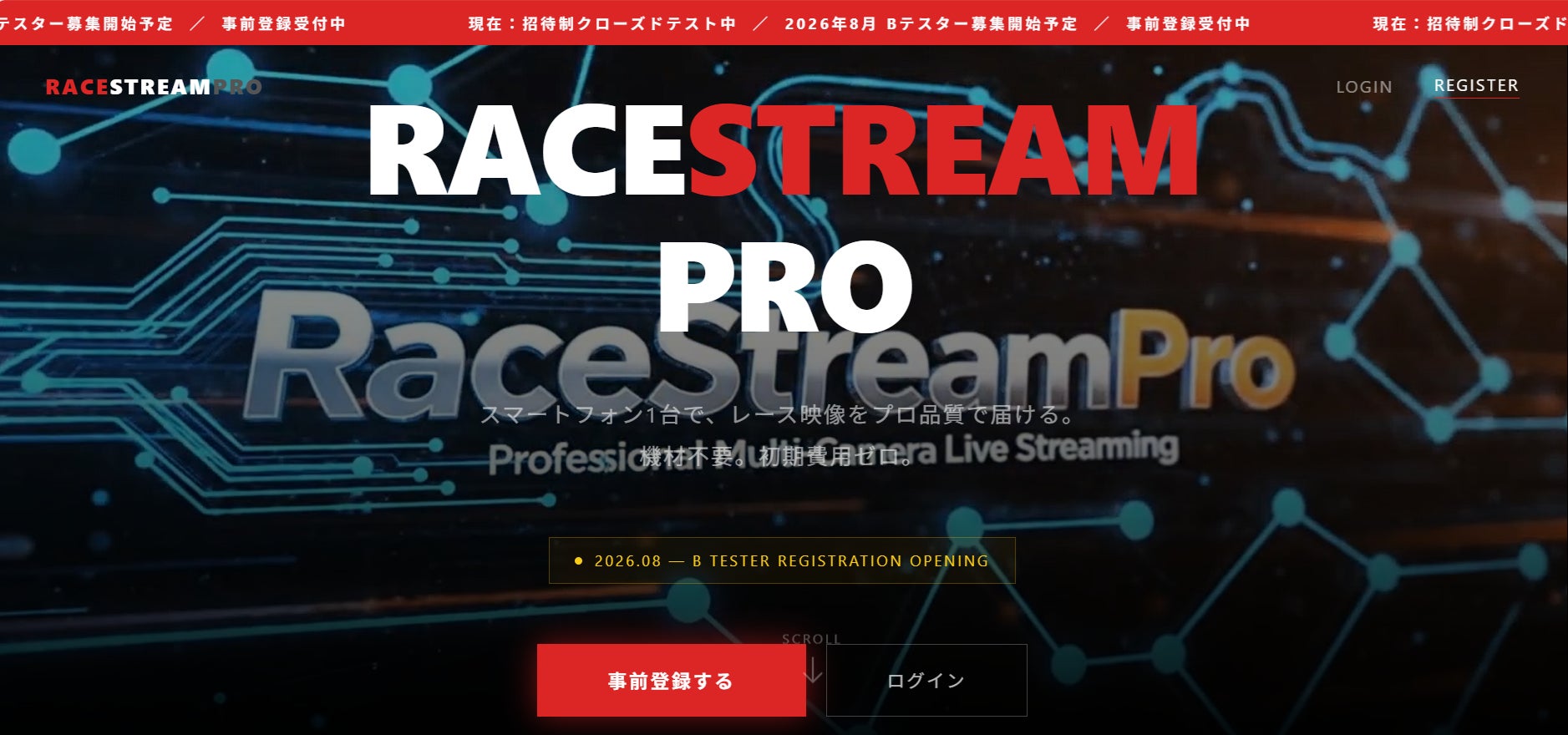 ■進捗状況2026年4月:LP(ランディングページ)公開完了実施内容: LP(https://rsp.beql.jp/)を正式公開いたしました。LPではRaceStreamProの主要機能とサービス内容を紹介しており、以下の情報を掲載しています: 主要機能 最大8台のスマートフォン...
