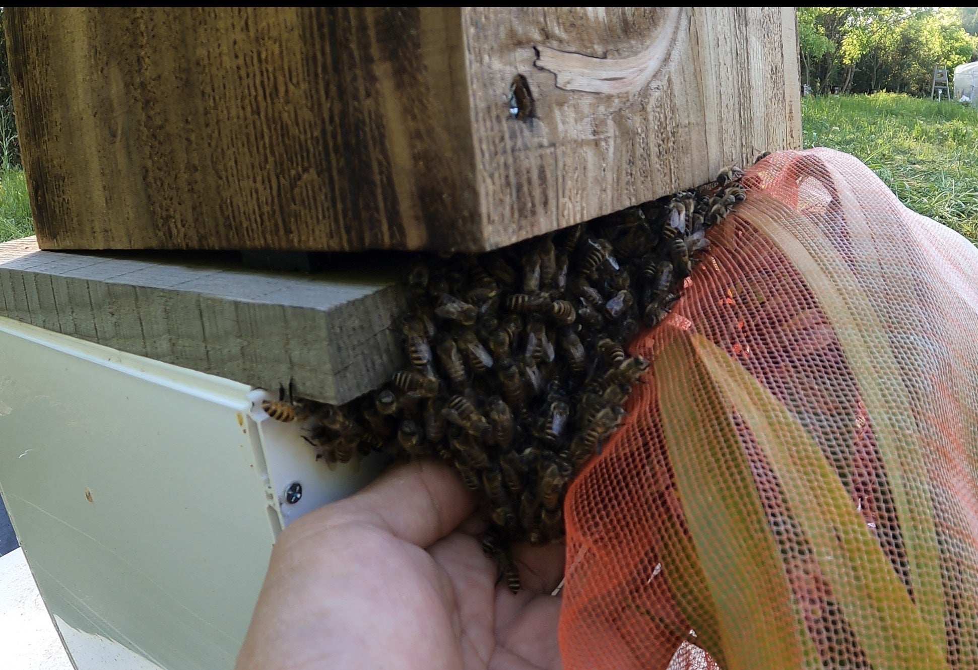 昨日は、集まった群れが巣箱の入口下で固まり、今にも入居しそうな雰囲気でした。刺激しないように手でそっと押し上げ、入口へ導いてみましたが、最終的には中へ入らず、そのまま去ってしまいました。自然相手の日本ミツバチは、本当にこちらの思い通りにはいきません。あと一歩と思っても、決まらない時は決まらない...