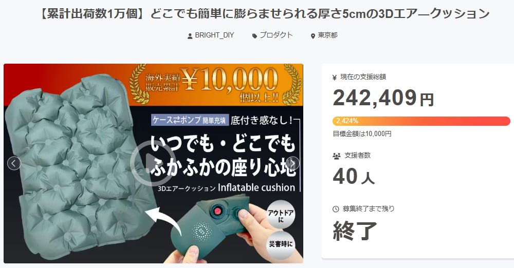 ご支援者様、【累計出荷数1万個】どこでも簡単に膨らませられる厚さ5cmの3Dエア―クッションにご興味をお持ちいただきありがとうございます。プロジェクト開始から54日目で40人ものご支援者の方々より支援頂き、無事プロジェクト終了を迎えることが出来ました。早速皆様のリターンを2026年02月末にお...