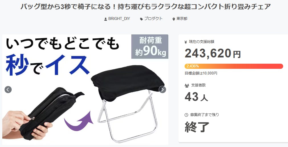 ご支援者様、バッグ型から3秒で椅子になる!持ち運びもラクラクな超コンパクト折り畳みチェアにご興味をお持ちいただきありがとうございます。プロジェクト開始から53日目で43人ものご支援者の方々より支援頂き、無事プロジェクト終了を迎えることが出来ました。早速皆様のリターンを2026年04月末にお届け...