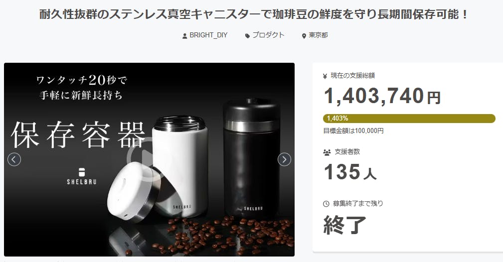 ご支援者様、耐久性抜群のステンレス真空キャニスターで珈琲豆の鮮度を守り長期間保存可能!にご興味をお持ちいただきありがとうございます。プロジェクト開始から43日目で135人ものご支援者の方々より支援頂き、無事プロジェクト終了を迎えることが出来ました。早速皆様のリターンを2026年04月末にお届け...