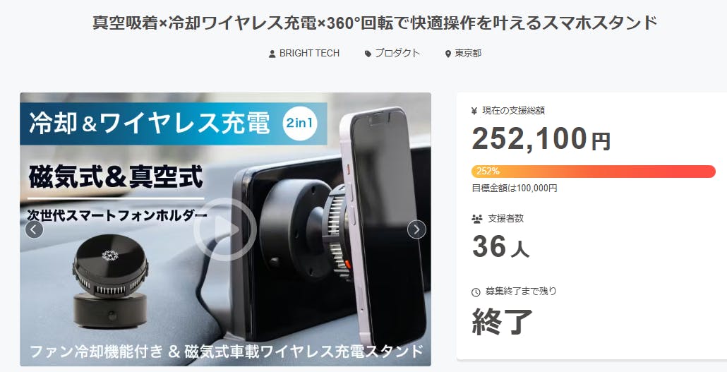 ご支援者様、真空吸着×冷却ワイヤレス充電×360°回転で快適操作を叶えるスマホスタンドにご興味をお持ちいただきありがとうございます。プロジェクト開始から51日目で36人ものご支援者の方々より支援頂き、無事プロジェクト終了を迎えることが出来ました。早速皆様のリターンを2026年04月末にお届けで...