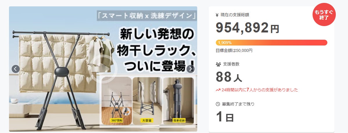 皆さまこのたびは【干すも収納もこれ一台!省スペース&360°回転の革新ハンガーラック】プロジェクトにご支援を賜り、誠にありがとうございます。プロジェクト終了まで残り1日間となりました!!!ここまで、応援していただいまきました皆様には本当に感謝しています。本当にありがとうございました。残り、少し...