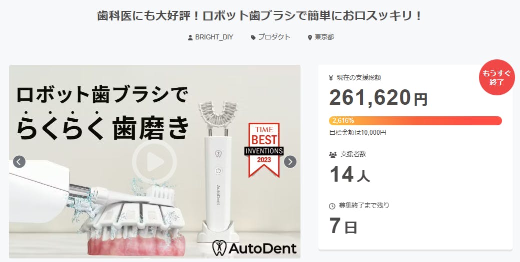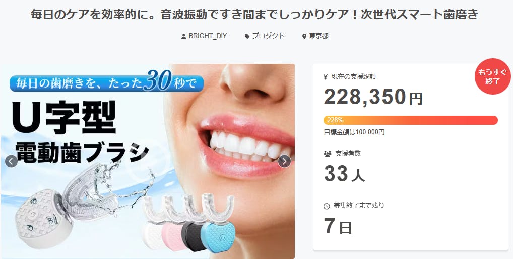 ご支援者様、毎日のケアを効率的に。音波振動ですき間までしっかりケア!次世代スマート歯磨きにご興味をお持ちいただきありがとうございます。お陰様で、開始から支援総額20万円達成することができました!終了までわずか7日となります。<虫歯や歯周病を防ぐ一番の方法は、毎日の歯磨きを正しく続けること...