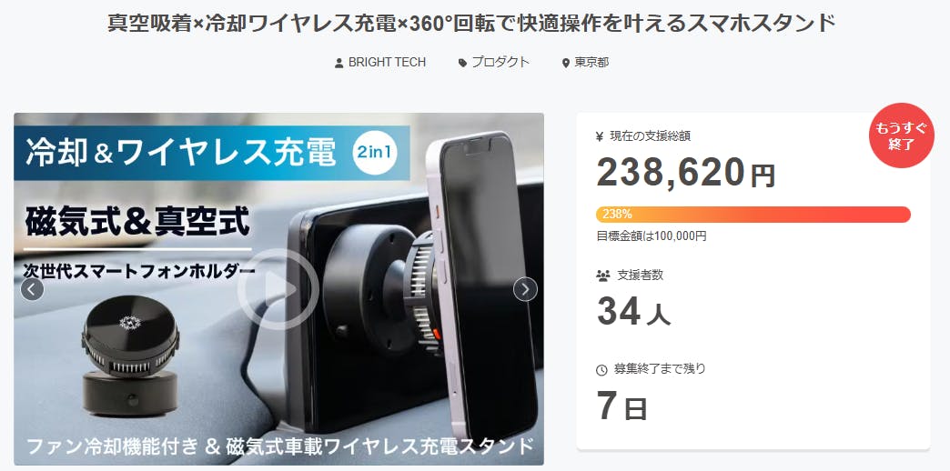 ご支援者様、真空吸着×冷却ワイヤレス充電×360°回転で快適操作を叶えるスマホスタンドにご興味をお持ちいただきありがとうございます。お陰様で、開始から支援総額20万円達成することができました!終了までわずか7日となります。<冷却機能、ワイヤレス充電、スタイリッシュなデザインをひとつに融合...
