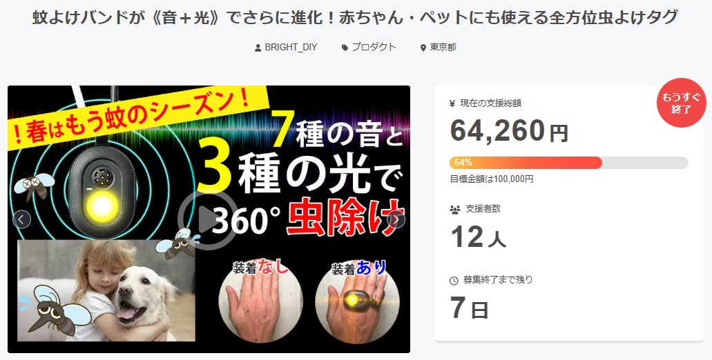 ご支援者様、蚊よけバンドが《音+光》でさらに進化!赤ちゃん・ペットにも使える全方位虫よけタグにご興味をお持ちいただきありがとうございます。お陰様で、開始から支援総額6万円達成することができました!終了までわずか7日となります。<① 薬剤不使用 ② 臭いなし ③ 環境に優しい ④ 高齢者や...