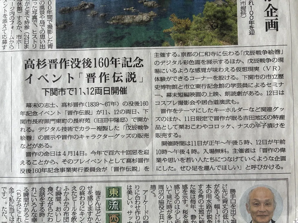 イベントまで残りわずか。先日取材を受けたのですが、今日山口新聞に掲載されました。150回忌の時に知り合った記者さんが、イベントについてとても詳細に書いてくれています。ありがとうございます! そして、Jcomが4/12に取材に来てくださるという連絡もありました。録画をして、4/25の11時から地...