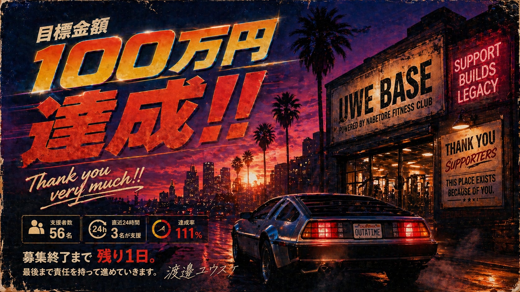 現在、1,116,340円、達成率111%まで到達しています。目標金額は1,000,000円。すでに56名もの方にご支援いただいています。さらに、直近24時間で3名の方からご支援がありました。募集終了まで残り1日。このたび、目標金額100万円を達成することができました!!ここまでご支援いただい...