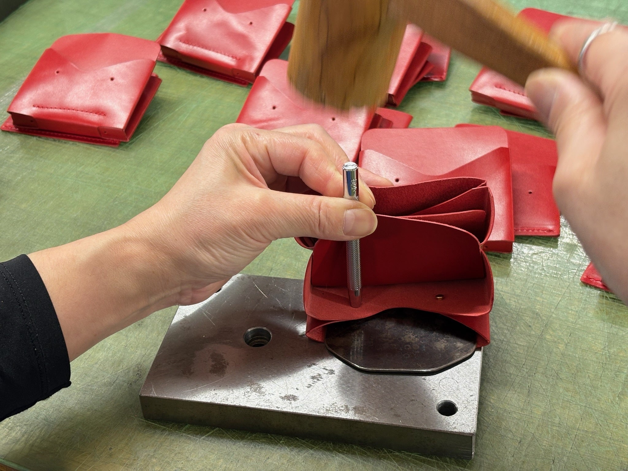 担当の石原です。今回は、仕上げ作業として行っている「組み立て工程」の様子をお届けします。製品には、革同士をしっかりと固定するためにカシメ(金具)を使用しています。このカシメ留めは、すべて職人が手作業で、一つひとつ丁寧にハンマーで打ち込む工程です。今回の製品ではカシメは10カ所。5つのパーツを組...