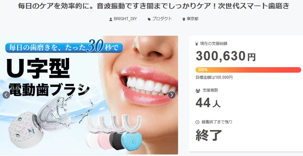 ご支援者様、毎日のケアを効率的に。音波振動ですき間までしっかりケア!次世代スマート歯磨きにご興味をお持ちいただきありがとうございます。プロジェクト開始から50日目で44人ものご支援者の方々より支援頂き、無事プロジェクト終了を迎えることが出来ました。早速皆様のリターンを2026年04月末にお届け...