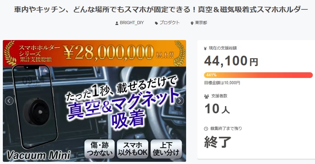 ご支援者様、車内やキッチン、どんな場所でもスマホが固定できる!真空&磁気吸着式スマホホルダーにご興味をお持ちいただきありがとうございます。プロジェクト開始から47日目で10人ものご支援者の方々より支援頂き、無事プロジェクト終了を迎えることが出来ました。早速皆様のリターンを2026年04月末にお...
