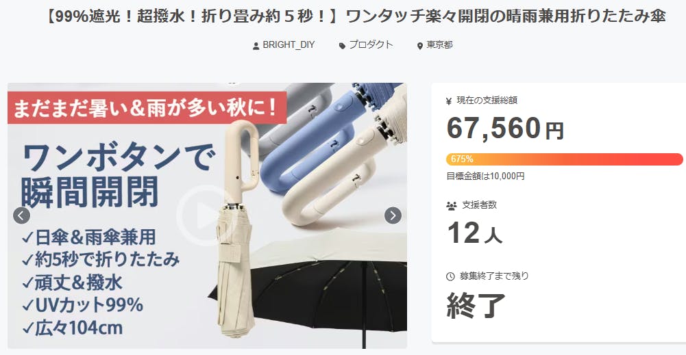 ご支援者様、【99%遮光!超撥水!折り畳み約5秒!】ワンタッチ楽々開閉の晴雨兼用折りたたみ傘にご興味をお持ちいただきありがとうございます。プロジェクト開始から46日目で12人ものご支援者の方々より支援頂き、無事プロジェクト終了を迎えることが出来ました。早速皆様のリターンを2026年04月末にお...