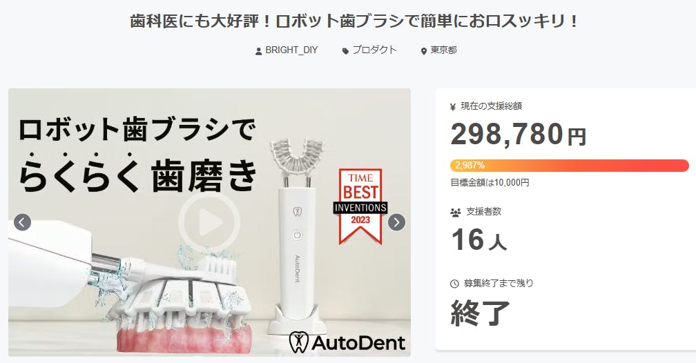 ご支援者様、歯科医にも大好評!ロボット歯ブラシで簡単にお口スッキリ!にご興味をお持ちいただきありがとうございます。プロジェクト開始から52日目で16人ものご支援者の方々より支援頂き、無事プロジェクト終了を迎えることが出来ました。早速皆様のリターンを2026年02月末にお届けできるよう準備を始め...