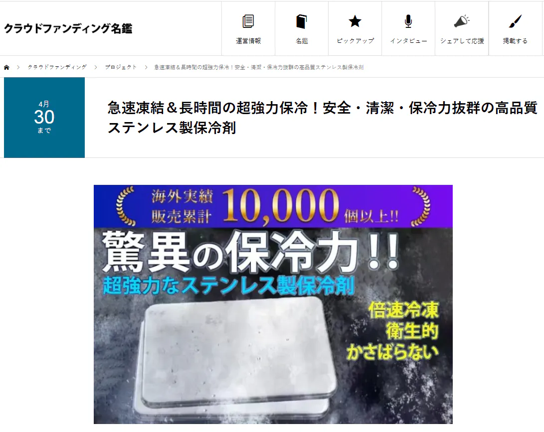 皆様、こんばんは!Bright DIYチームです。先日、クラウドファンディング名鑑で「ICE PLATE」を紹介して頂きました。話題:急速凍結&長時間の超強力保冷!安全・清潔・保冷力抜群の高品質ステンレス製保冷剤興味がある方、是非下記のリンクからアクセスしてみてください。https://cro...