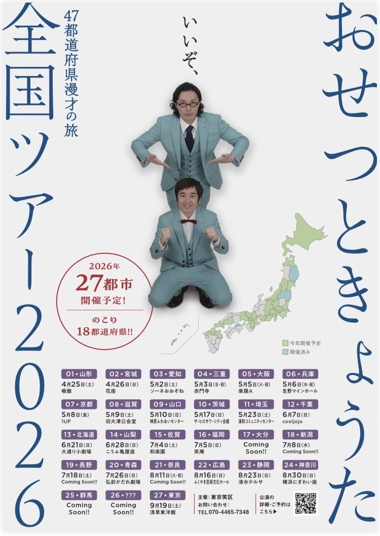 おはようございます!今、山形に向かう新幹線の中です。ついに本日、全国ツアー2026の初日を迎えます。ドキドキ、ワクワク。今年は27ヶ所を計画して、昨年にも増して、色んな方のお世話になっております。無事に初日を迎えられて良かったです。気合い入れて!一本一本のネタに集中してやっていきます‼︎滋賀公...