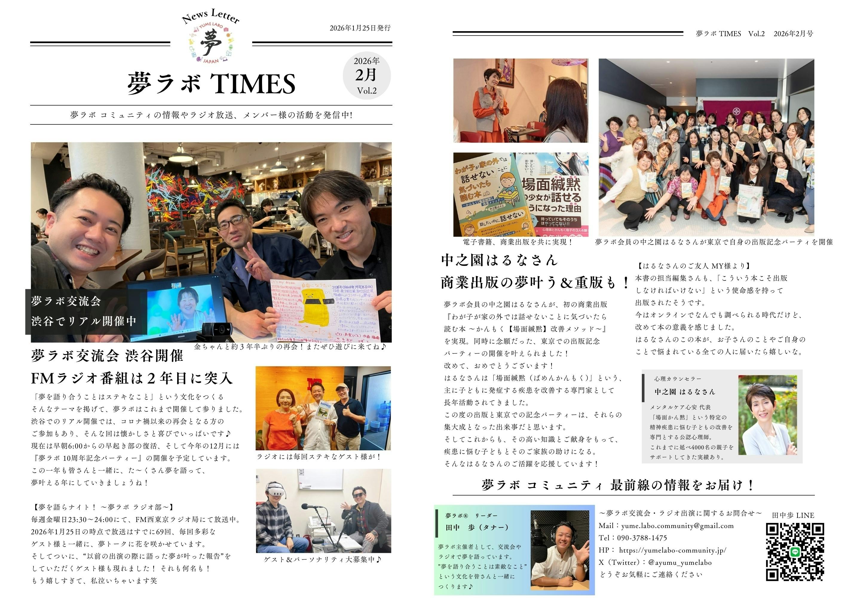 【夢ラボ コミュニティのニュースレター最新刊を発行しました!】2026年2月号 最新ニュースレターを公開します。夢ラボ コミュニティのイベントやラジオ放送、メンバー様のご活躍などを発信中です!今後も夢ラボ最前線の情報を毎月お届けします♪どうぞご覧ください^^