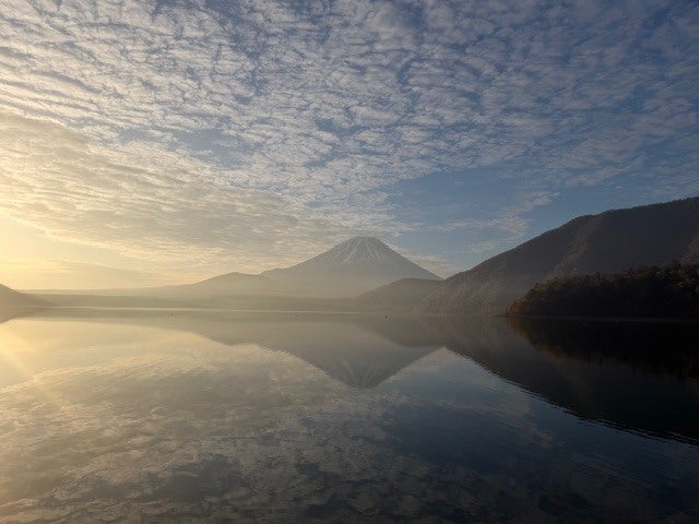 日本のお札で有名な本栖湖から見る逆さ富士です。風がない朝や夕方に見る事が出来ます。10kmも走れば癒される景色がたくさんあります。