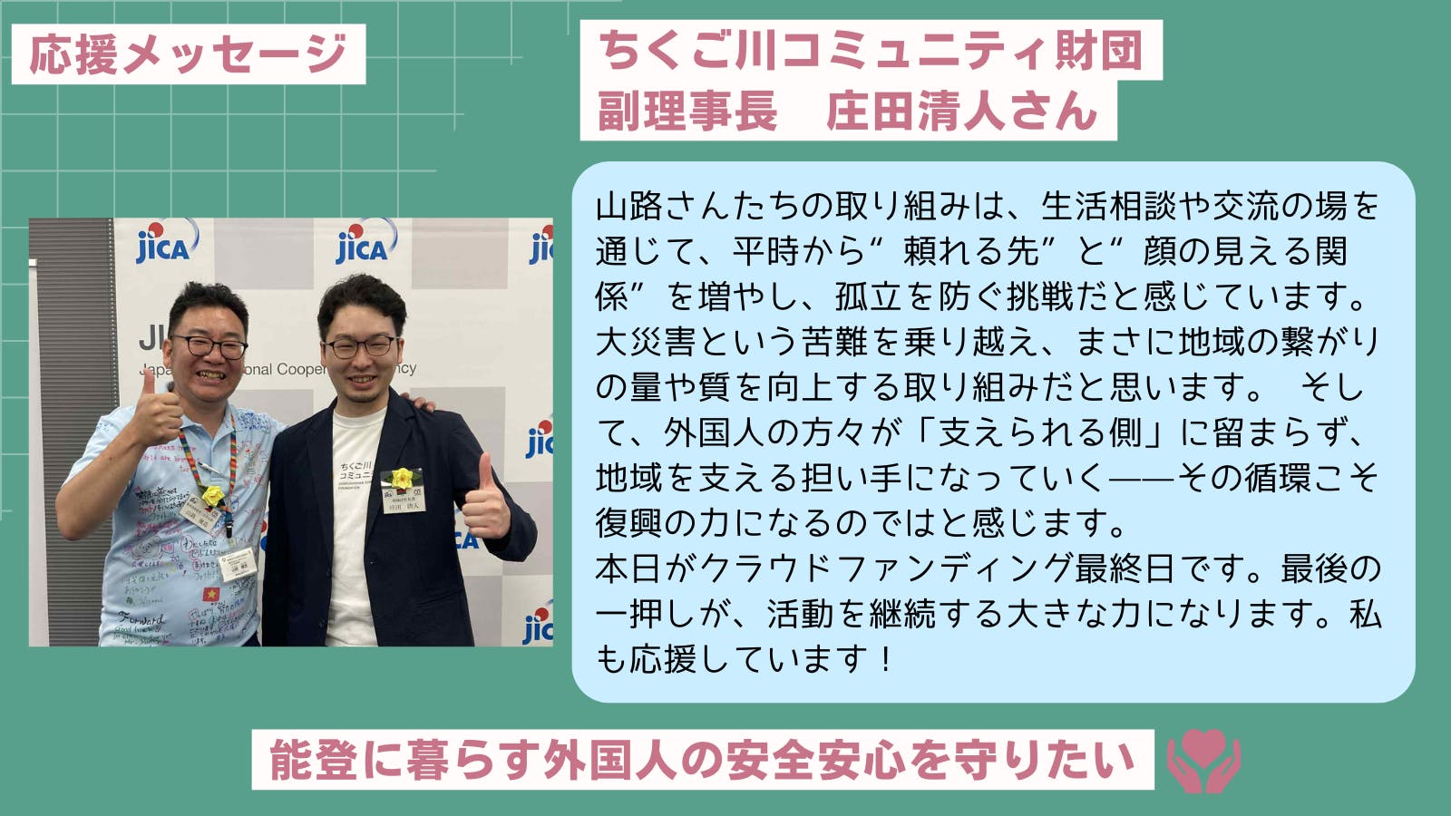 多文化人材活躍支援センター・山路です。クラウドファンディングも最終日です。追加で、JICA海外協力隊同期であり、親友であり、ライバルでもある、公益財団法人ちくご川コミュニティ財団副理事長の庄田清人さんから応援メッセージをいただきました! 庄田さんとは、JICA海外協力隊の派遣前訓練の中で出会...