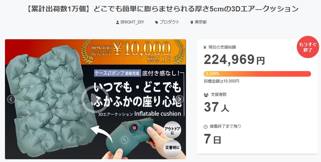 ご支援者様、【累計出荷数1万個】どこでも簡単に膨らませられる厚さ5cmの3Dエア―クッションにご興味をお持ちいただきありがとうございます。お陰様で、開始から支援総額20万円達成することができました!終了までわずか7日となります。<【1月31日までの支援ですぐ届く! 】屋内・屋外いつでもど...