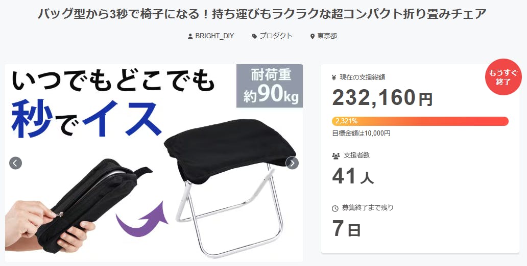 ご支援者様、バッグ型から3秒で椅子になる!持ち運びもラクラクな超コンパクト折り畳みチェアにご興味をお持ちいただきありがとうございます。お陰様で、開始から支援総額20万円達成することができました!終了までわずか7日となります。<組立てわずか3秒!いつでもどこでも座りたいときにすぐ座れます。...