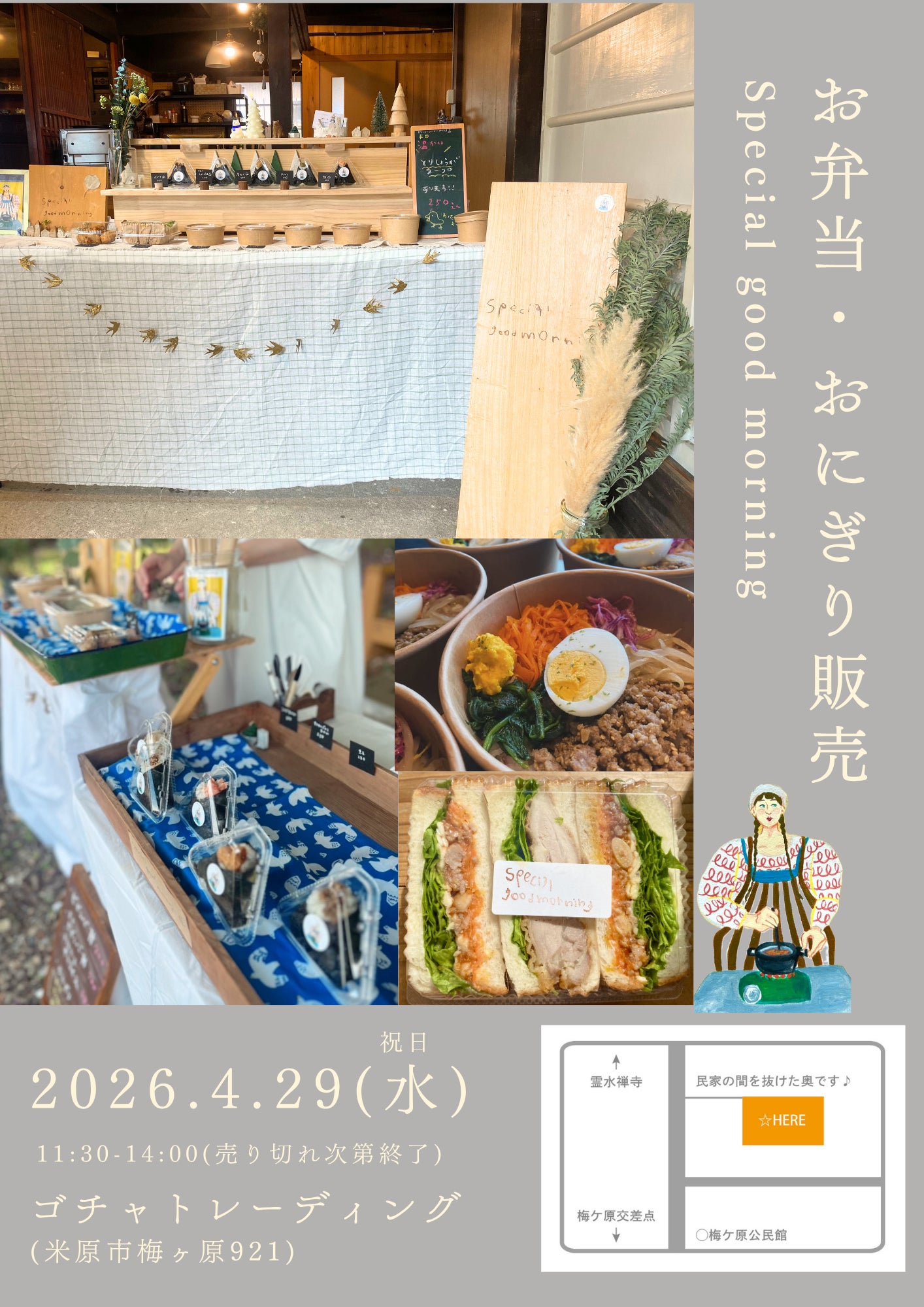 4/29(水)11:30-14:00明日、ゴチャトレーディングさんにておにぎりとお弁当の販売をさせていただきます。毎回、梅ヶ原のご近所の皆さまにお越しいただいたり、遠方からお車で足を運んでくださる方々、嬉しく思っております。ありがとうございます。^ ^お近くにお越しの際は、ぜひお気軽にお立ち寄...