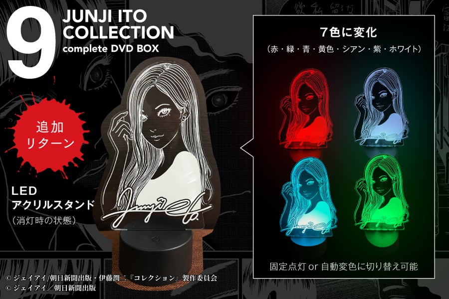 この度は、「伊藤潤二『コレクション』 完全版 DVD-BOX」復刻プロジェクトに関心をお寄せいただき、そして数あるプロジェクトの中からご支援を賜り、誠にありがとうございます。550万円達成を記念し、新たなリターンアイテムを追加いたしました。本プロジェクトの描き下ろしイラストを使用した、アクリル...