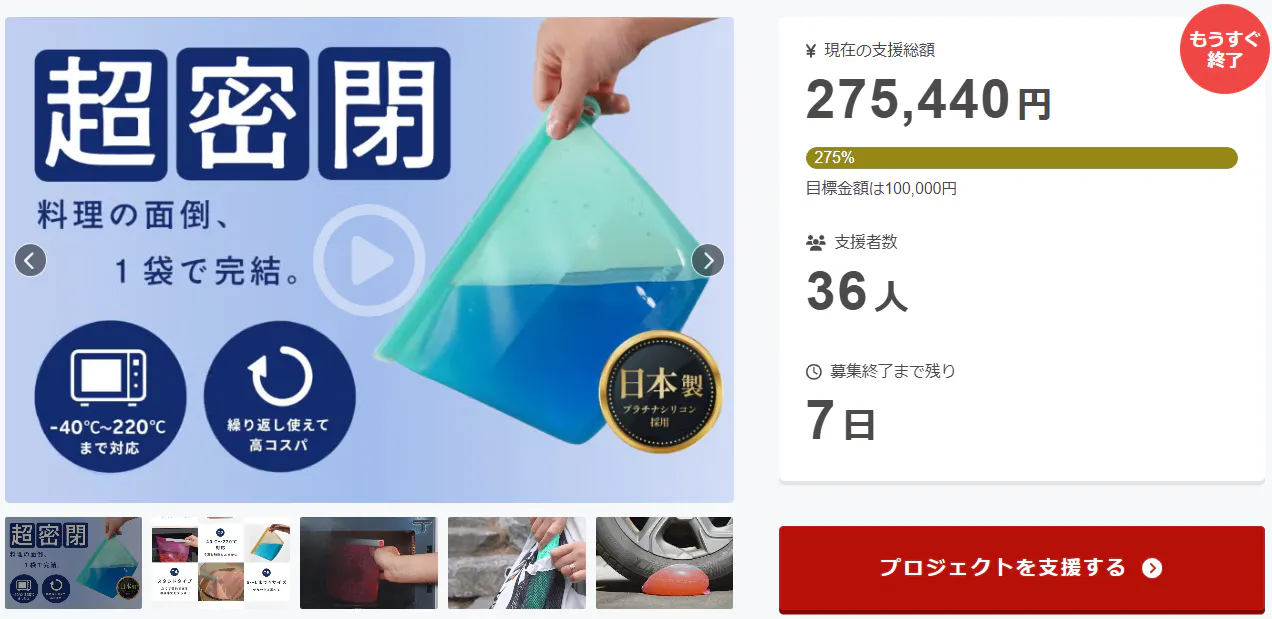 ご支援者様、【−40〜220℃まで対応】冷凍庫でも液漏れしない、日本素材が生んだ超密閉バッグにご興味をお持ちいただきありがとうございます。お陰様で、開始から支援 総額20万円達成することができました!終了までわずか 7 日となります。下準備して保存した食材をそのままグリルだって可能。調理工程の...