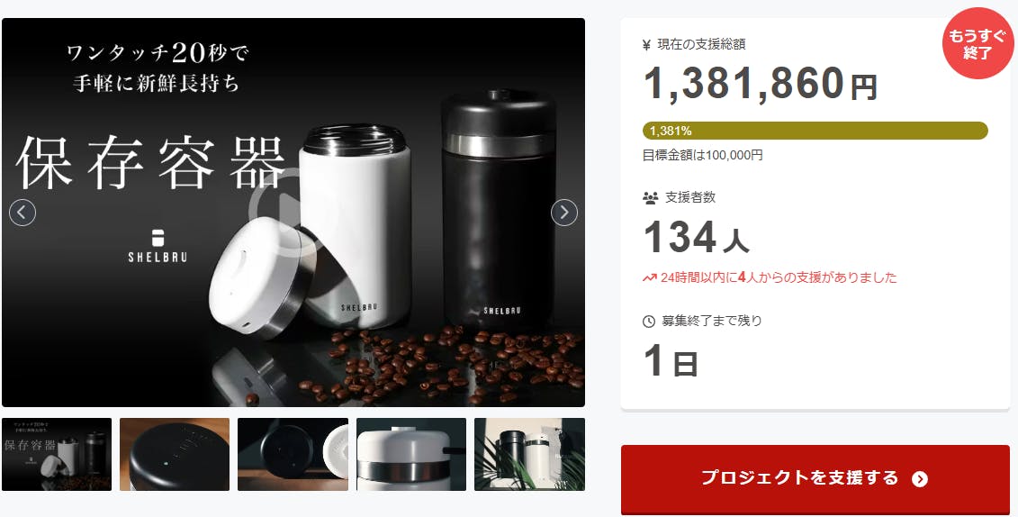 ご支援者様、耐久性抜群のステンレス真空キャニスターで珈琲豆の鮮度を守り長期間保存可能!にご興味をお持ちいただきありがとうございます。お陰様で、開始から支援総額138万円達成することができました!終了までわずか 1 日となります。<ワンタッチでわずか20秒、誰でも簡単に真空保存ができる新し...
