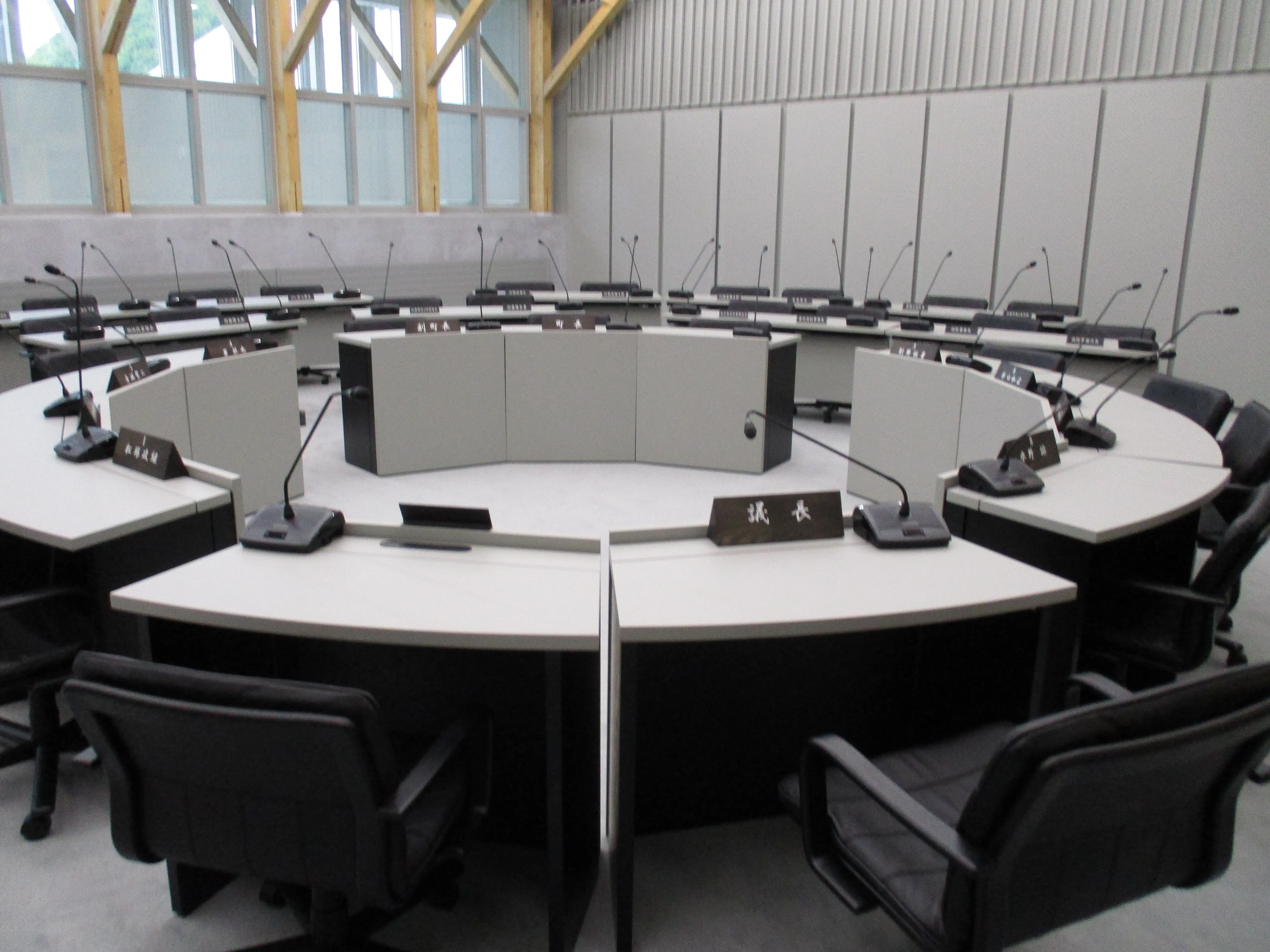 こんにちは!町の合同庁舎内の議会議場です。普段は多目的ホール、避難場所になります。議員の定数は8人です。やはり高齢の方が多いですね。明上雅孝。