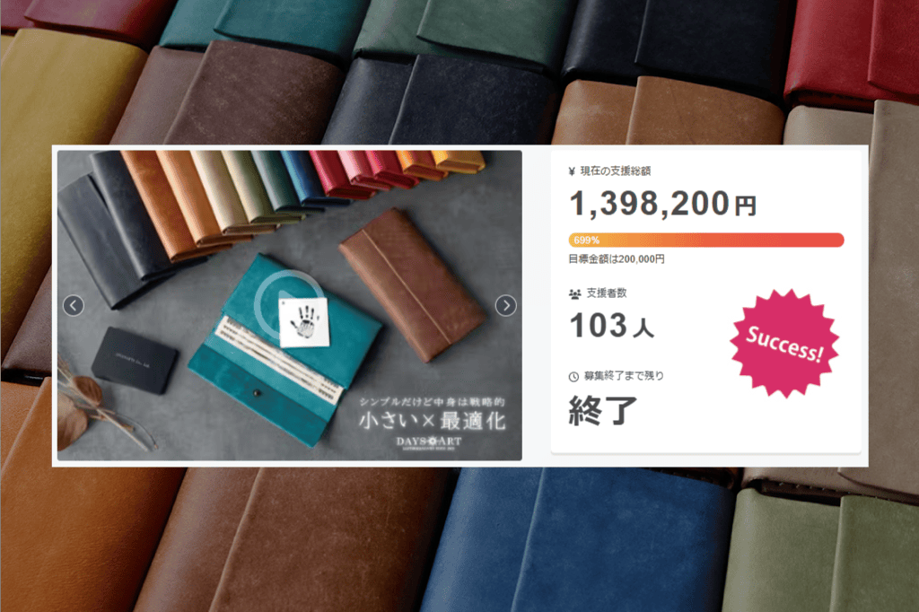 こんにちは、DAYSARTです。この度は、当プロジェクトにご支援頂きまして本当にありがとうございます。目標を達成することができました事改めて御礼申し上げます。今回のプロジェクトにて好評頂きました「シンプルだけど中身は戦略的 ”構造を最適化した” DAYSARTの小さい長財布。」の定番化が決定し...