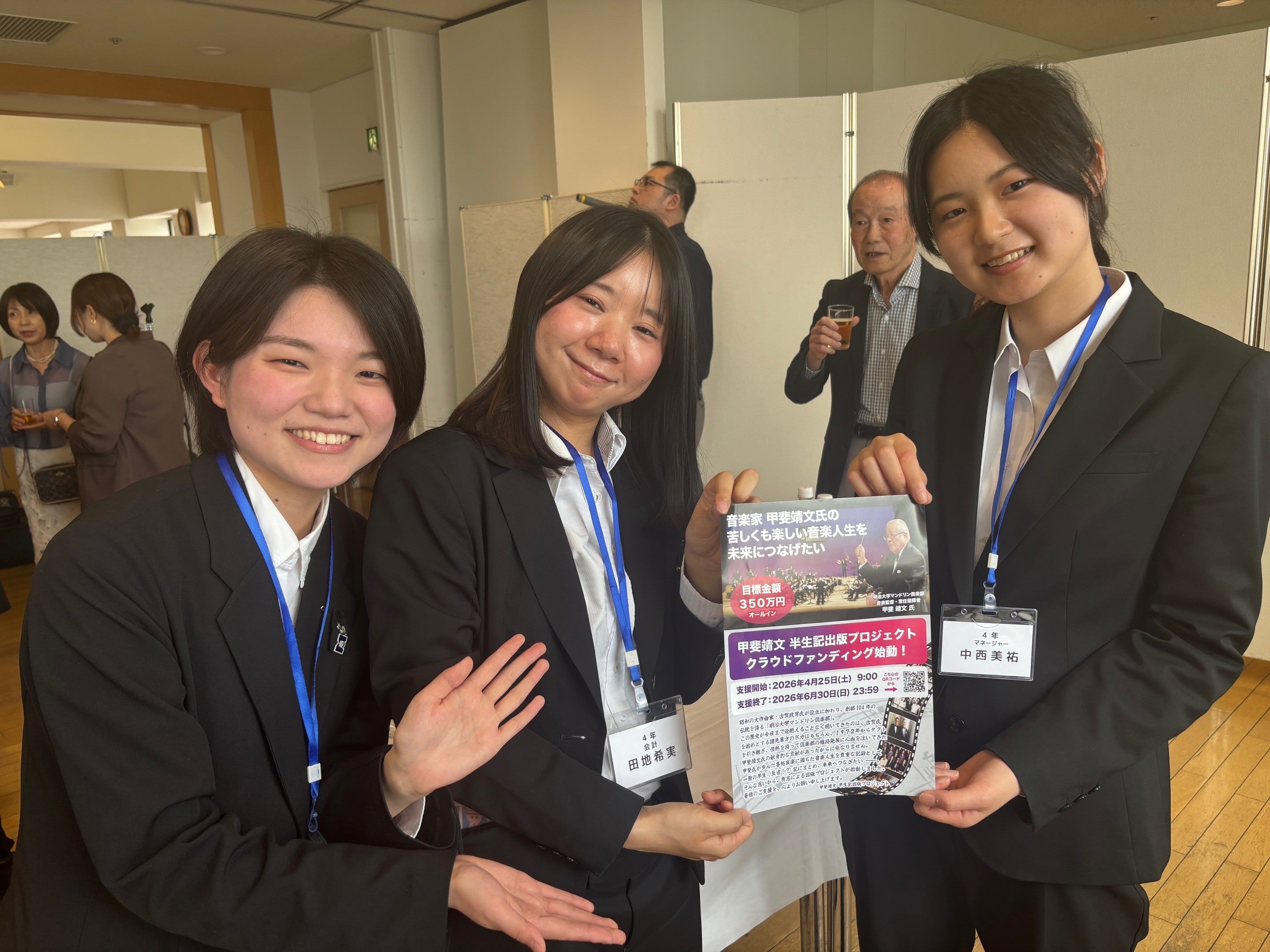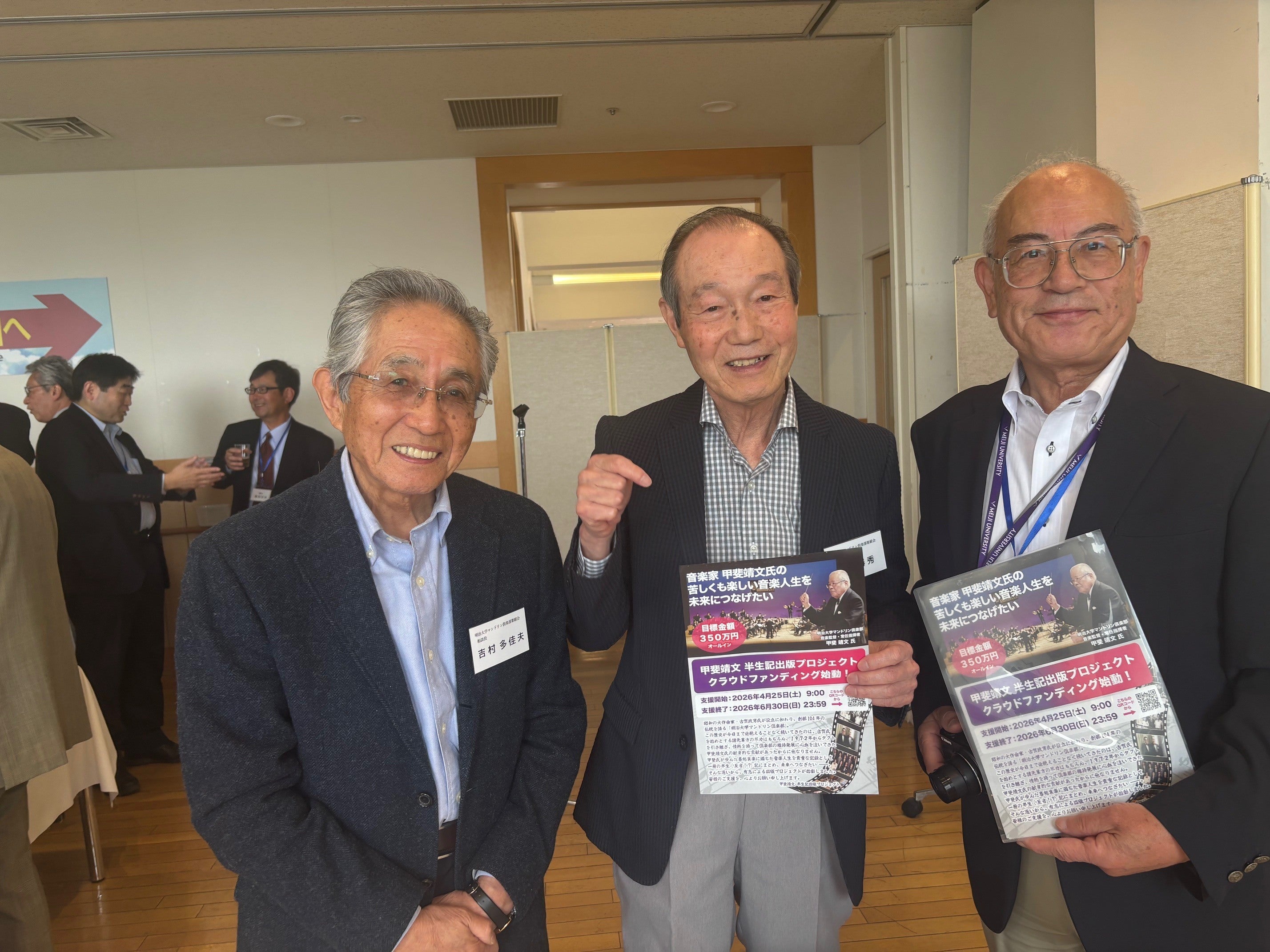 明治大学マンドリン俱楽部紫紺会の定時総会で出席者にプロジェクトの告知をしました。6月に87歳を迎える甲斐靖文先生を囲んでメモリアルショット!右隣は本日最年長95歳になる根田先輩です。お二人とも歳を感じさせず、いつもダンディですね。一番左端が本プロジェクトのリーダー林先輩です。その右隣が有志のメ...