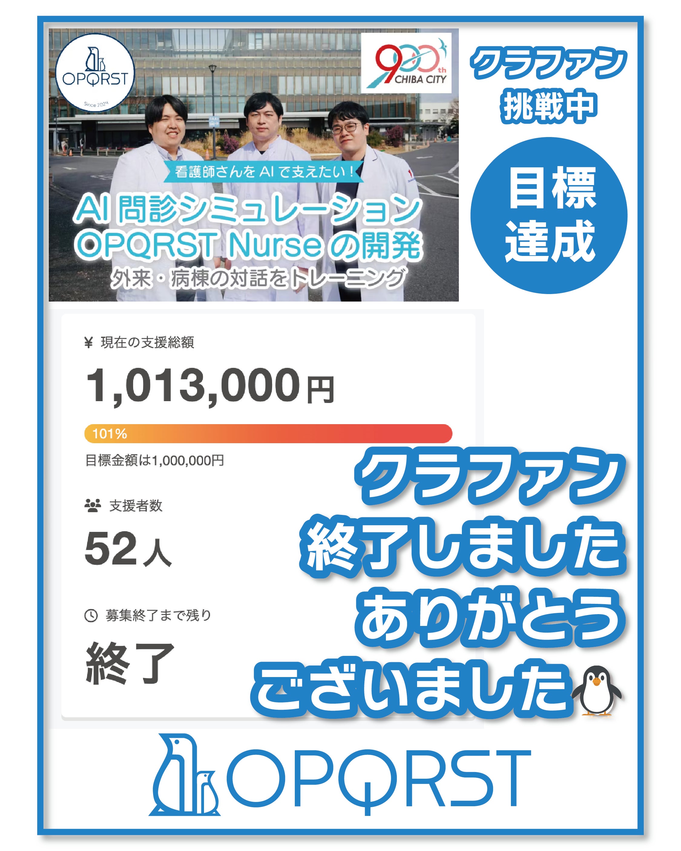 おはようございます、OPQRSTです残り24時間の時点で62%でしたが、最終日、皆様からのご支援を受けて、無事目標金額を超える101.3%を達成しました!のべ52名の方にご支援いただきゴールを迎えることができました。 本当にありがとうございました!これからも私たちのプロジェクトは続きます皆様か...