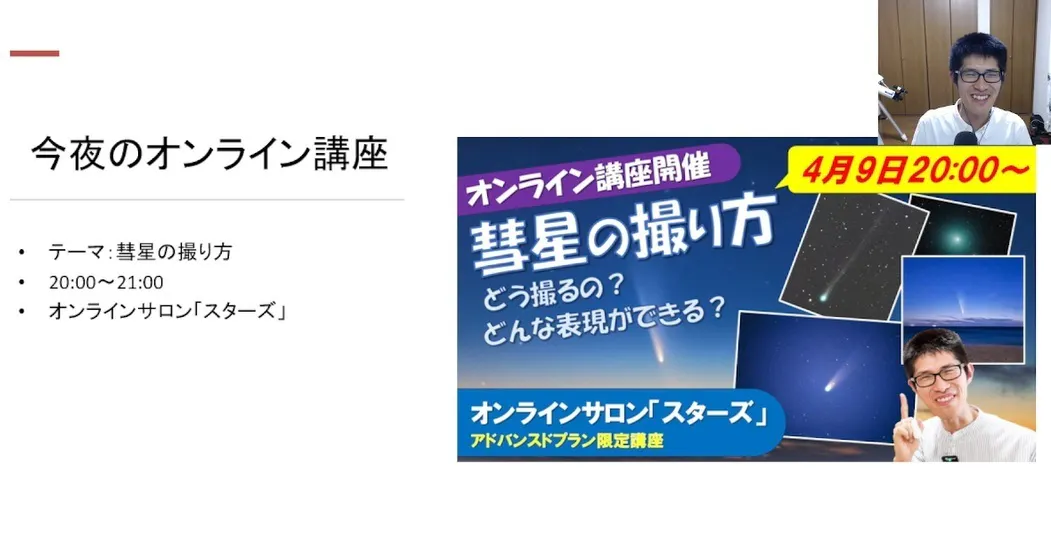 【昨夜のオンライン講座、ありがとうございました^^】ーオンラインサロン「スターズ」アドバンスドプラン限定ーご参加くださった皆さま、本当にありがとうございました^^今回は「見ごろを迎えたパンスターズ彗星を撮ろう!」をテーマに、彗星の撮り方をお話ししました☄・どんな機材が必要?・どんなふうに撮れる...