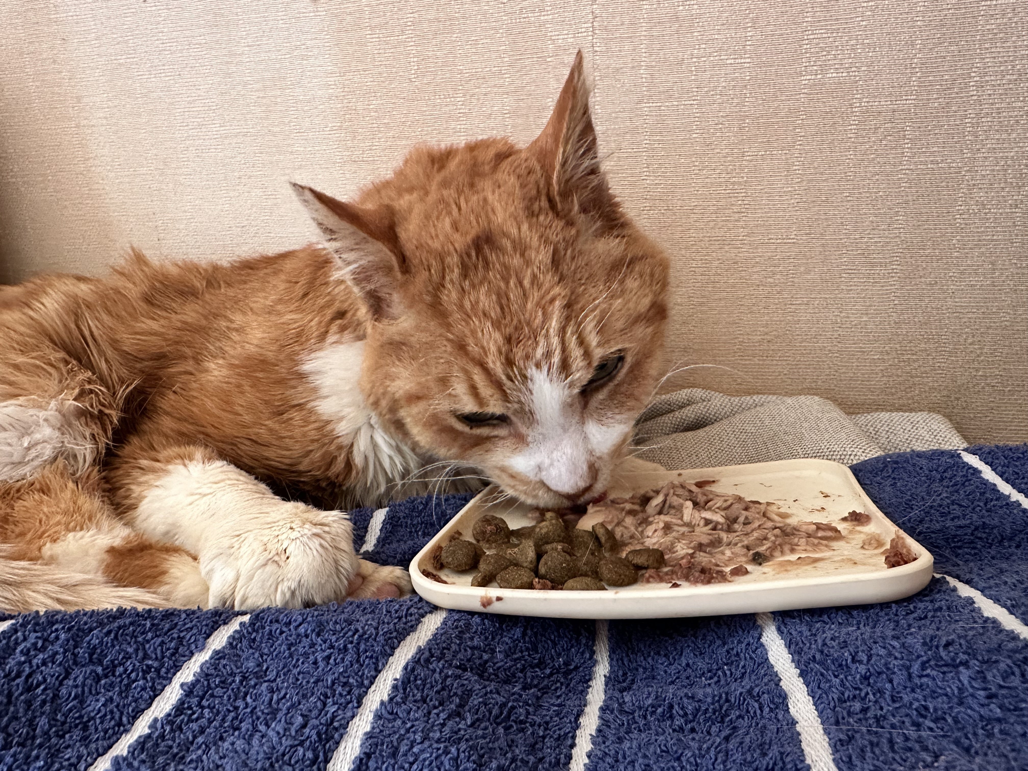 体調が安定してきたと感じるチャトラ。お気に入りの場所から動かないものの、ごはんをしっかり食べてくれました。点滴後です。肉球の色が貧血で白っぽかったのですが、血色が良いピンク色になりました。人も貧血気味だと爪が白っぽくなるのと同じで、猫の場合は肉球を見ると判断しやすいなと思いました。チャトラの治...