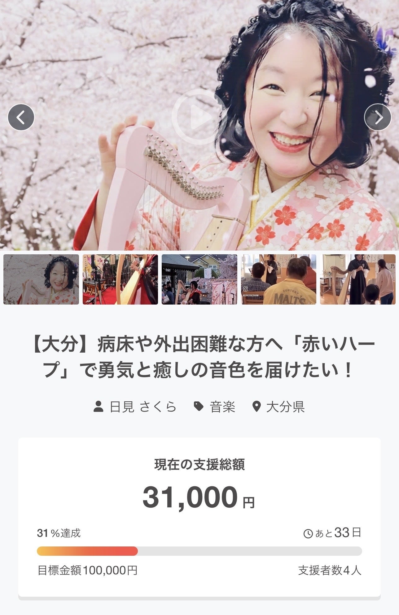 【皆さま、こんにちは】大分を拠点に活動しております、日見さくらです。クラウドファンディングを開始してから、心温まるご支援とメッセージを本当にありがとうございます。おかげさまで、現在31%まで到達することができました!【このプロジェクトに込めた想い】病床にいらっしゃる方や、外出が難しい方々のもと...