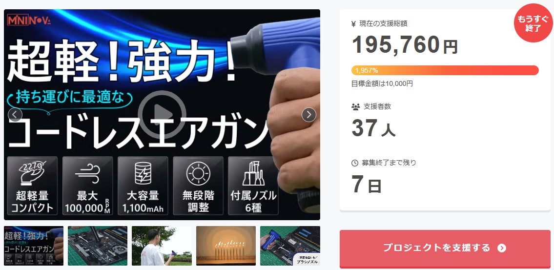 ご支援者 様、《完売御礼》パワフル&無段階調整でいつでも使いやすいコードレスエアガンにご興味をお持ちいただきありがとうございます。お陰様で、開始から支援総額19万円達成することができました!終了までわずか 7 日となります。プロジェクト終了後、「《完売御礼》パワフル&無段階調整でいつでも使いや...