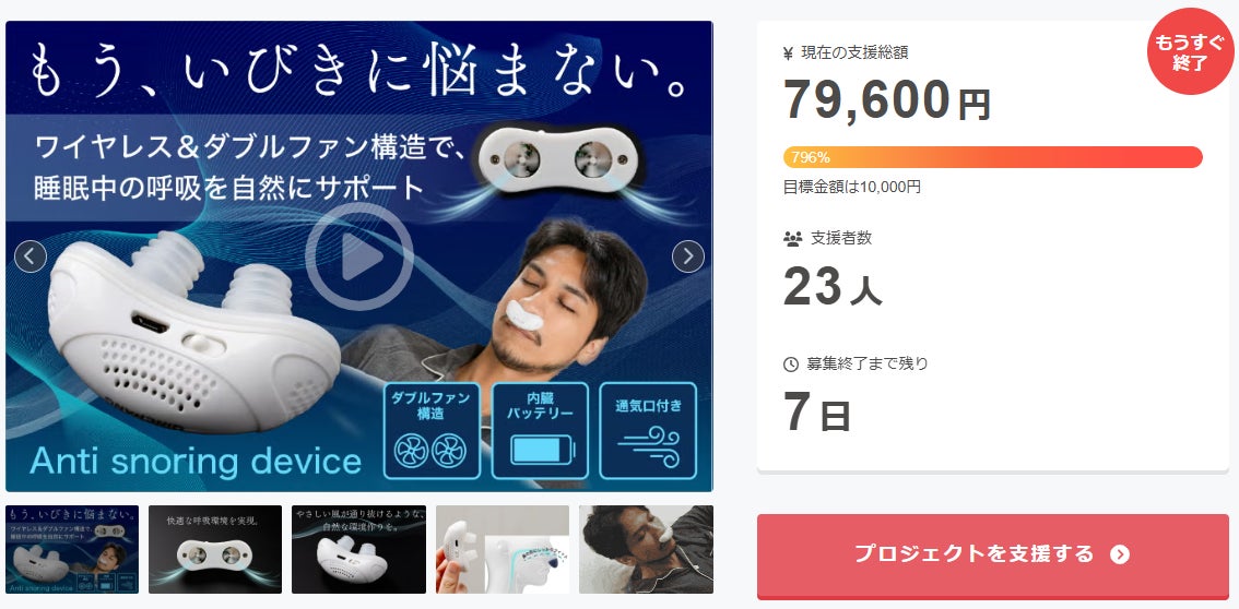 ご支援者 様、ワイヤレス&ダブルファン構造で睡眠中の呼吸を自然にサポート【いびきデバイス】にご興味をお持ちいただきありがとうございます。終了までわずか 7 日となります。プロジェクト終了後、「ワイヤレス&ダブルファン構造で睡眠中の呼吸を自然にサポート【いびきデバイス】」をCamfire特別価格...