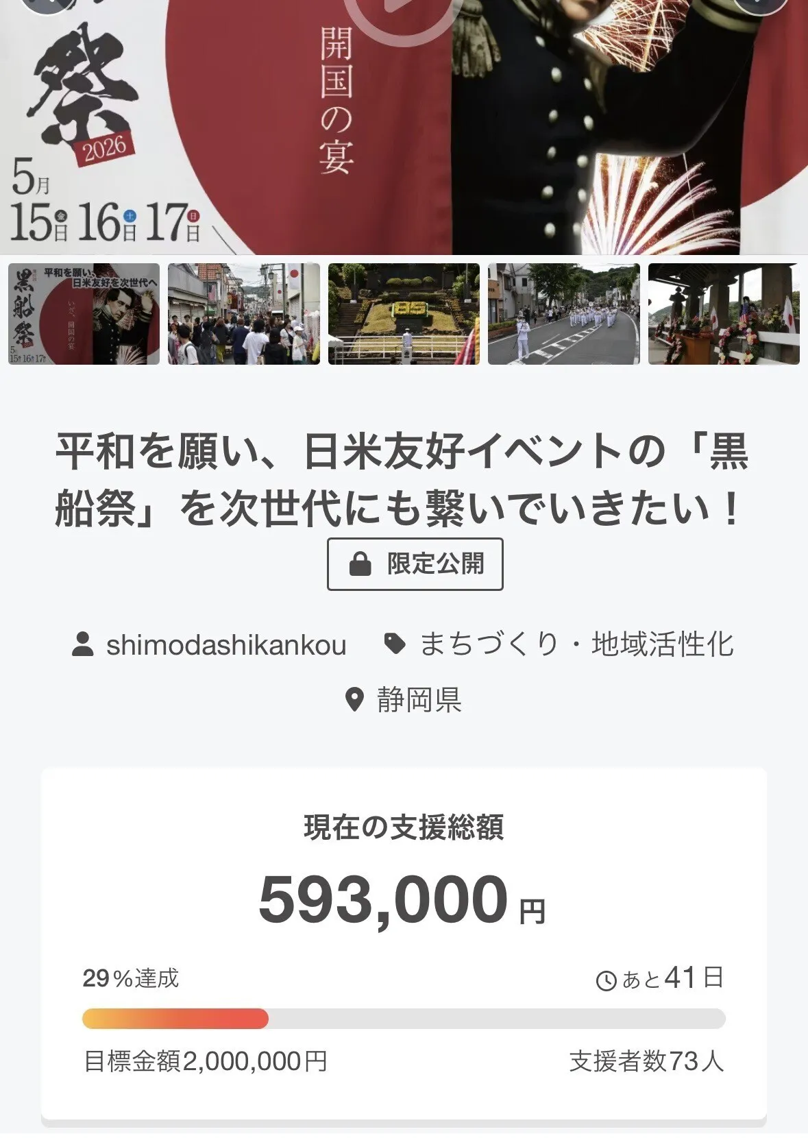50万円突破しました!ありがとうございます!もうそろそろ60万円、達成率も30%に到達しそうな勢いです。黒船祭まで40日を切りました。黒船祭クラウドファンディングはまだまだ実施中ですので引き続き応援よろしくお願いいたします!※企業向けは一部募集を終了しているものがございます。ご注意ください。