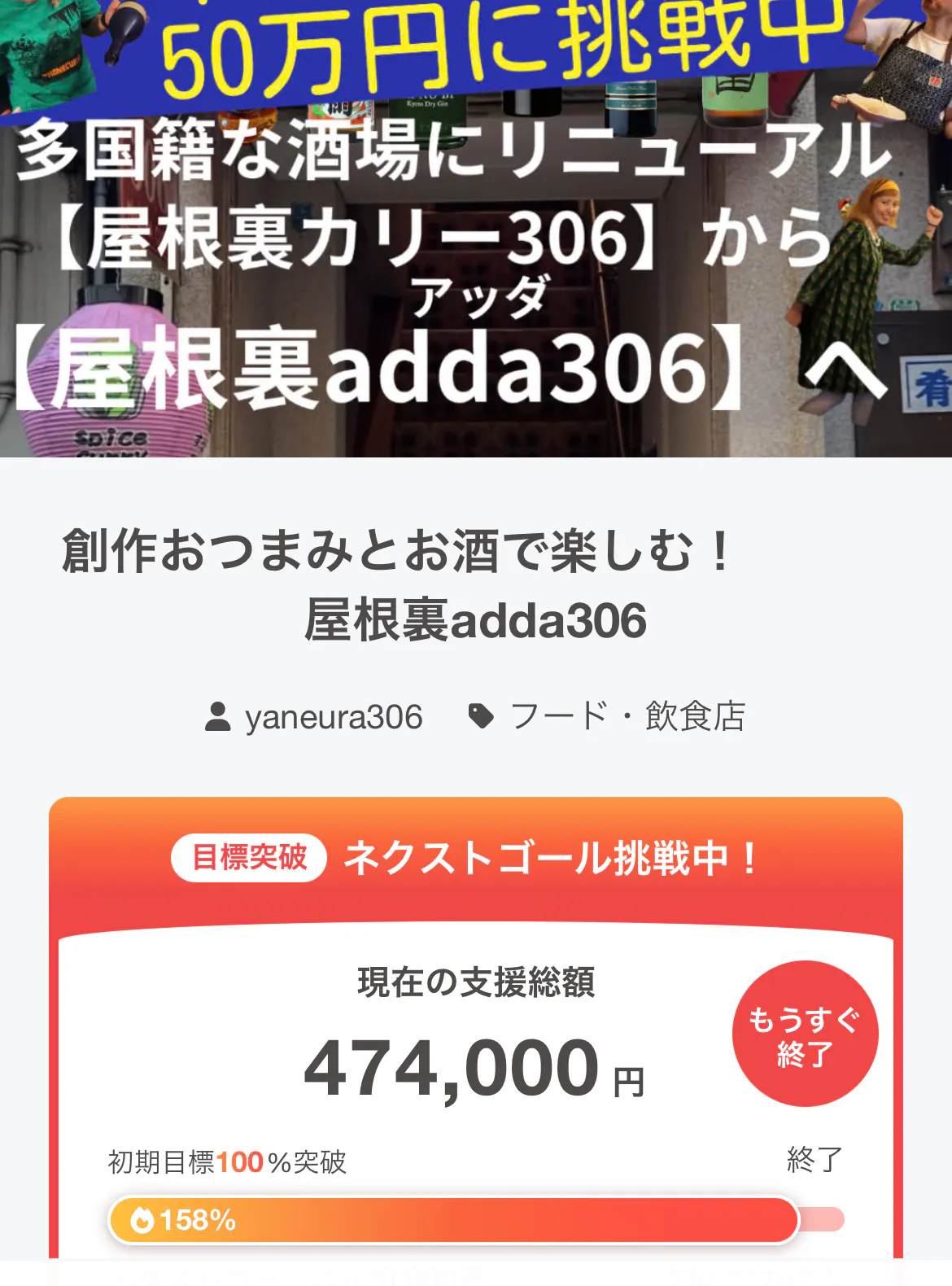 クラウドファンディング終了のお礼と目標達成の感謝を込めて2026/04/10 01:11こんばんわ昨日4月9日をもちまして、クラウドファンディングの全日程を終了いたしました。最終的な支援総額は 474,000円 となり、想像を遥かに超える多くの方々から温かいご支援と心強い応援メッセージをいただきました。心より感謝申し上げます。7年間続けた「屋根裏カリー306」を閉め、新しく「屋根...もっと見る