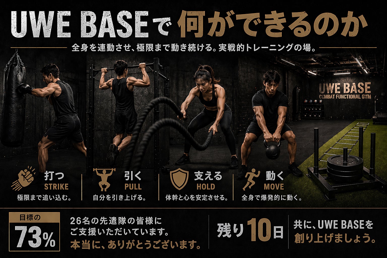 【UWE BASE で何ができるのか?】目標の73%到達、28名もの皆様の熱いご支援に心から感謝いたします!UWE BASEには、一般的なジムにあるようなマシンはありません。あるのは、身体の機能を極限まで引き出すための「実戦的器具」だけです。画像に並ぶ、主要設備の役割を解説します。■ サンドバ...