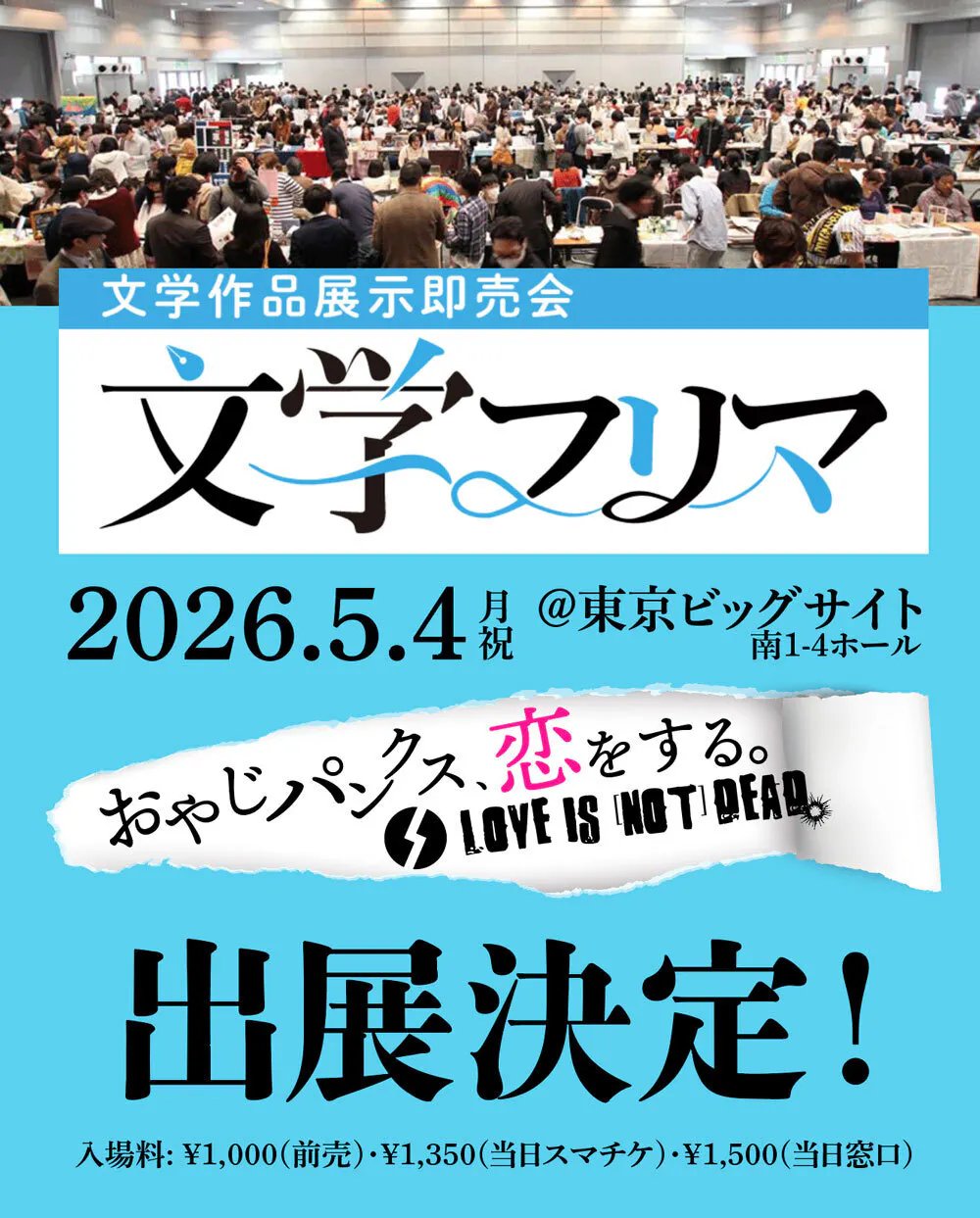 クラファンも佳境ですが、5/4に東京ビッグサイトで開催される「文学フリマ」に出展することになりました。--文学フリマとは…文学フリマは、作り手が「自らが〈文学〉と信じるもの」を自らの手で作品を販売する、文学作品展示即売会です。小説・短歌・俳句・詩・評論・エッセイ・ZINEなど、さまざまなジャン...