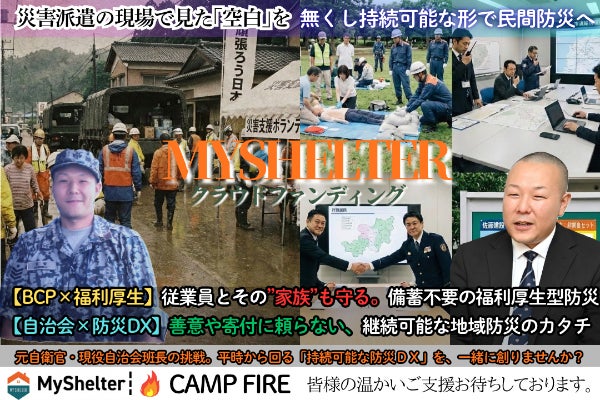 【大躍進のご報告】皆様の応援を力に!自治体での実証実験や、企業での全社導入が続々と決定しています2026/04/20 14:01支援者の皆様、そしてMyShelter(マイシェルター)を応援してくださっている皆様! 代表の末廣です。いつも温かいご支援をいただき、本当にありがとうございます。本日は、皆様に「とびきりワクワクするご報告」をお届けしたく、活動報告を更新いたしました。皆様からいただいたご支援と応援を力に、ここ数...もっと見る