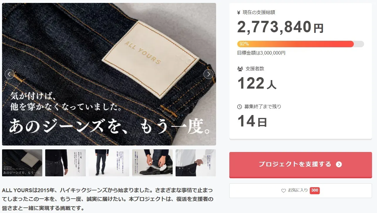 皆さま、こんにちは。ALL YOURSです。プロジェクト終了まで、残り14日 。ちょうど2週間となりました。 現在、122名の皆さまからご支援をいただき、達成率は92%。数字の伸びは少しずつではありますが、本日、とても嬉しい節目を迎えました。 このプロジェクトを見守ってくださる「お気に入り登録...