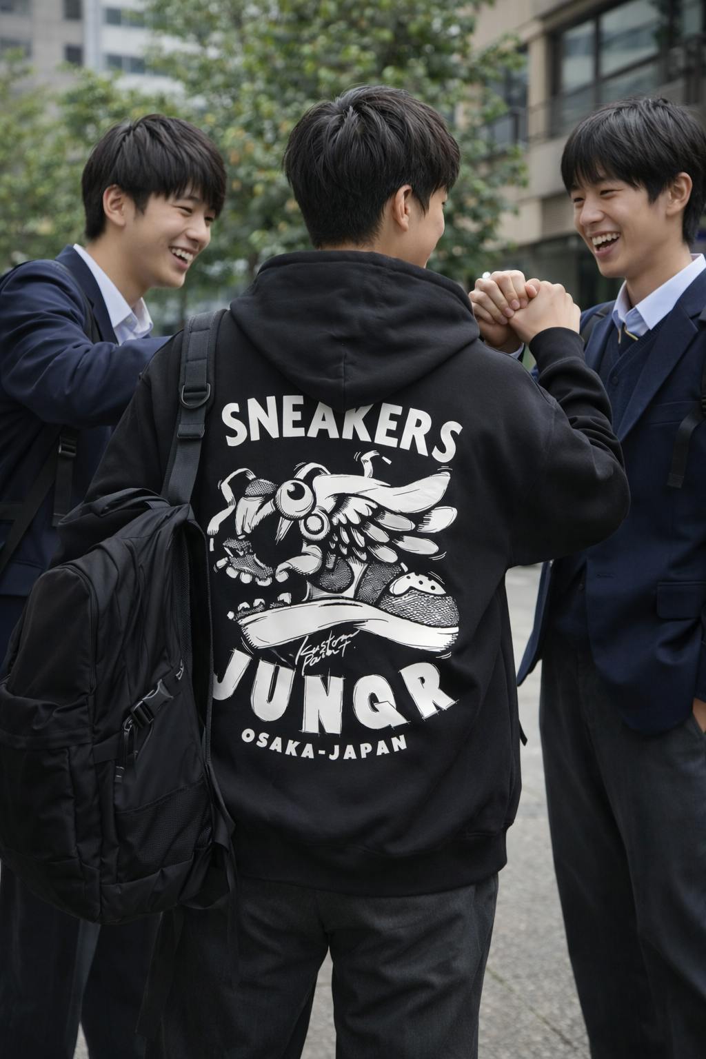 ラスト4日です!たくさんの応援ありがとうございます!スニーカーのリターンより何気に人気なのがアオ氏デザインのパーカーです!喜んで良いのか複雑ですが、デザインはめっちゃかっこいいので超オススメです!このパーカーにカスタムスニーカーを履けば、怖いものなしです!ぜひお子様のアウターに1着いかがですか?