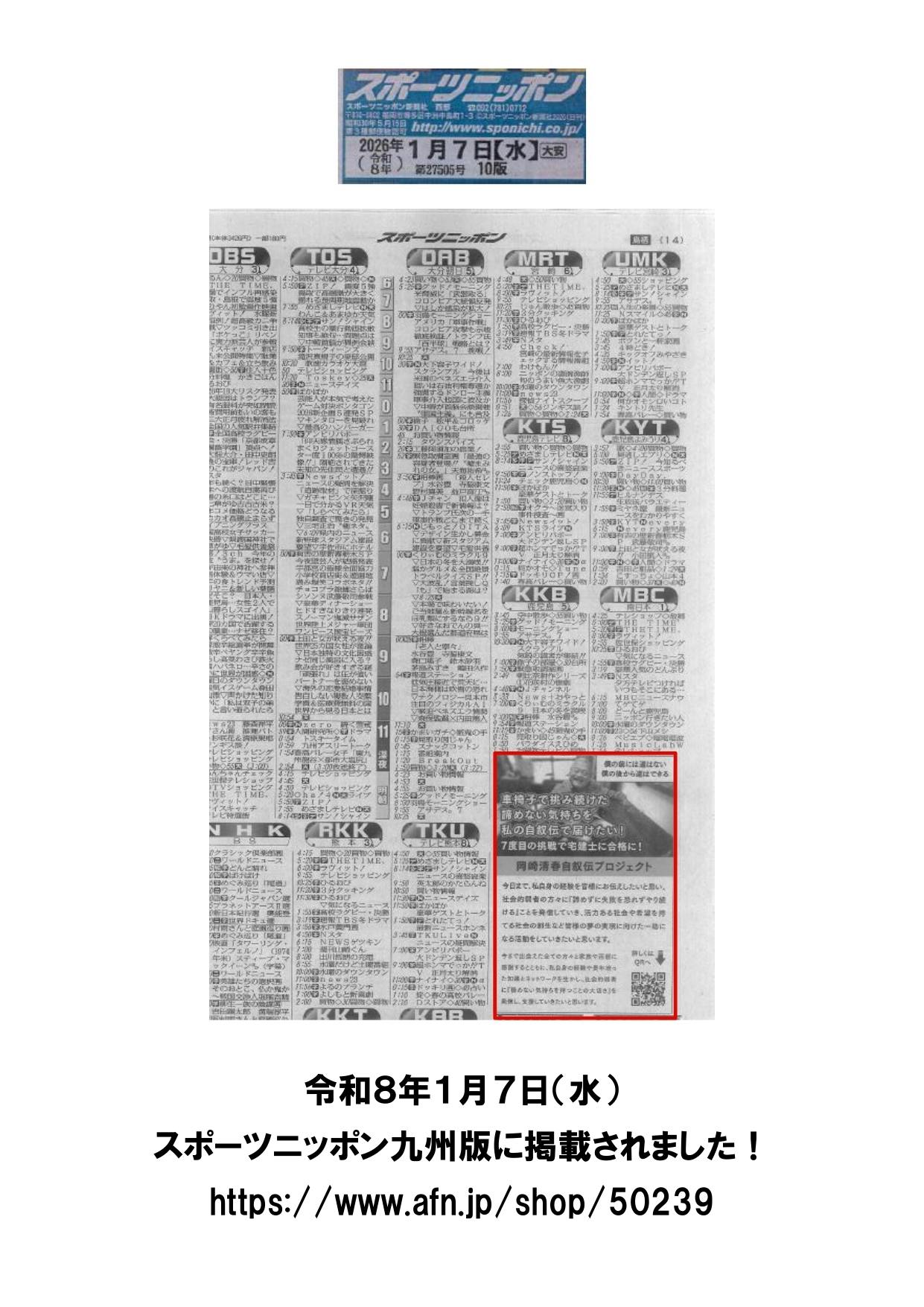 令和8年1月7日(水)、本プロジェクトが スポーツニッポン九州版 に掲載されました! 大手紙に取り上げていただけたことは、皆さまからのご支援と応援があってこそ実現したものであり、心より感謝申し上げます。記事では、私自身のこれまでの歩みや、自叙伝制作への思い、そして「諦めない気持ち」を多くの方に...