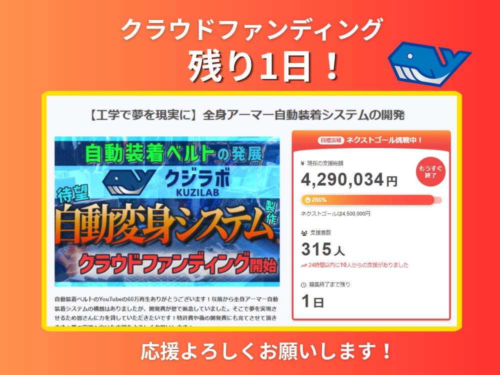 支援者の皆様、いつも温かい応援をありがとうございます。いよいよ、このクラウドファンディングも残り1日となりました。募集期間中、たくさんの温かいコメントをいただきました。その中には、「子供と一緒に何かを作ったエピソード」を添えてくださる方もいて、本当に胸が熱くなりました。私が今作っている「全身ア...