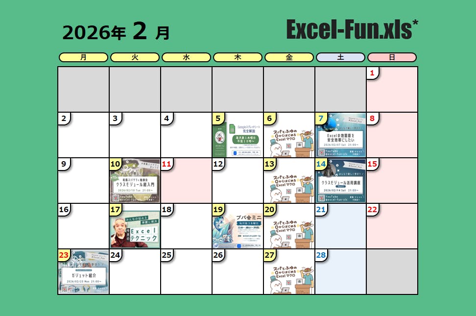 2月のスケジュールです♪YouTube配信対象の勉強会はExcel-Fun.xls*の公式YouTubeにてご視聴ください!https://www.youtube.com/@excel-fun-xlsその他勉強会の参加方法や最新情報はDiscordコミュニティ内でご確認ください!\ 参加者25...