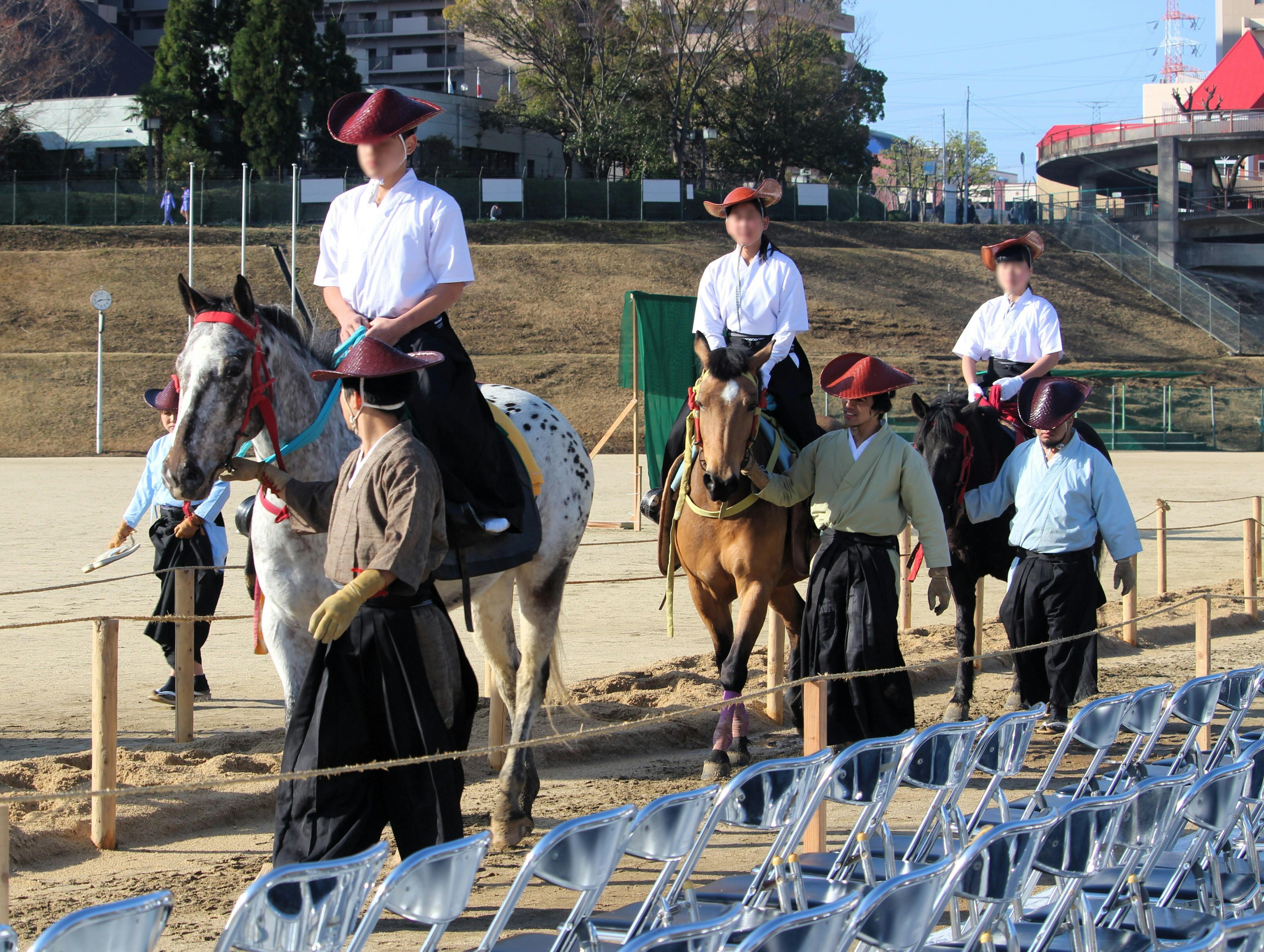 第2回流鏑馬まつり、朝練の一場面です。小笠原流の皆さまが引馬を行い、騎乗しているのは子ども流鏑馬のOB・OGたちです。本番では、彼らは的持ちなどの諸役を務めるほか、馬に乗って「布引」を行いました。布引は、射手と射手の合間に馬場を騎乗して走り、馬場の安全を確認する大切な役目です。観客の皆さまのす...
