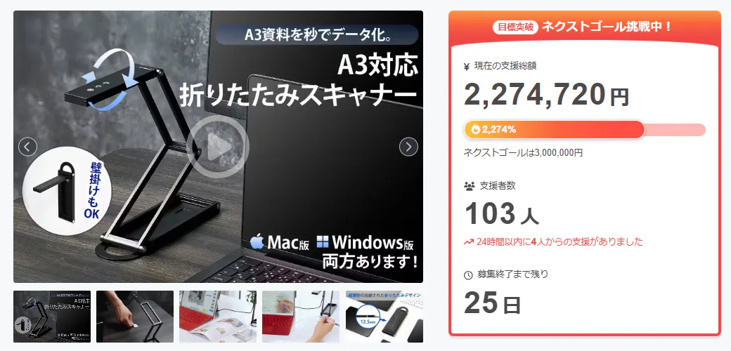 この度は「【会議資料を秒でデータ化!】A3対応折りたたみスキャナー」に支援 頂き誠にありがとうございます!お陰様で、開始から10万円の目標金額を2200%達成することができました。「デスクを広く使いたい。でも、高画質なスキャナーも諦めたくない」 そんな悩み、これ1台で解決です。厚さ12.5mm...