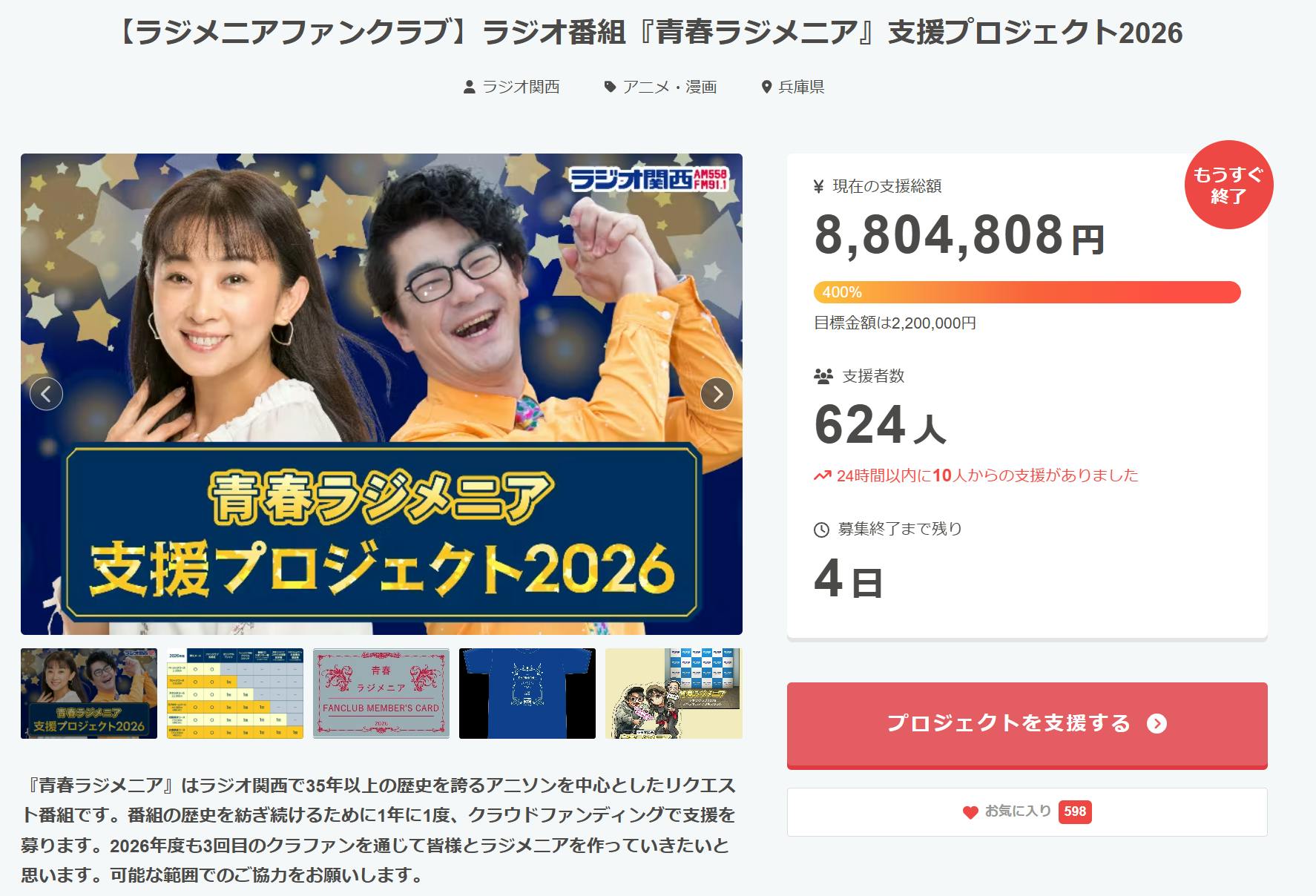 ラジメニアクラウドファンディング2026の支援受付期間も残すところ、あと数日。ついに支援総額が目標金額の400%を突破しました!そして支援者数も624人まで増え、心強いところです。毎週の放送が最大のリターン。そして番組40周年に向けて、1週、1週、ともに歴史を積み上げていきましょう!